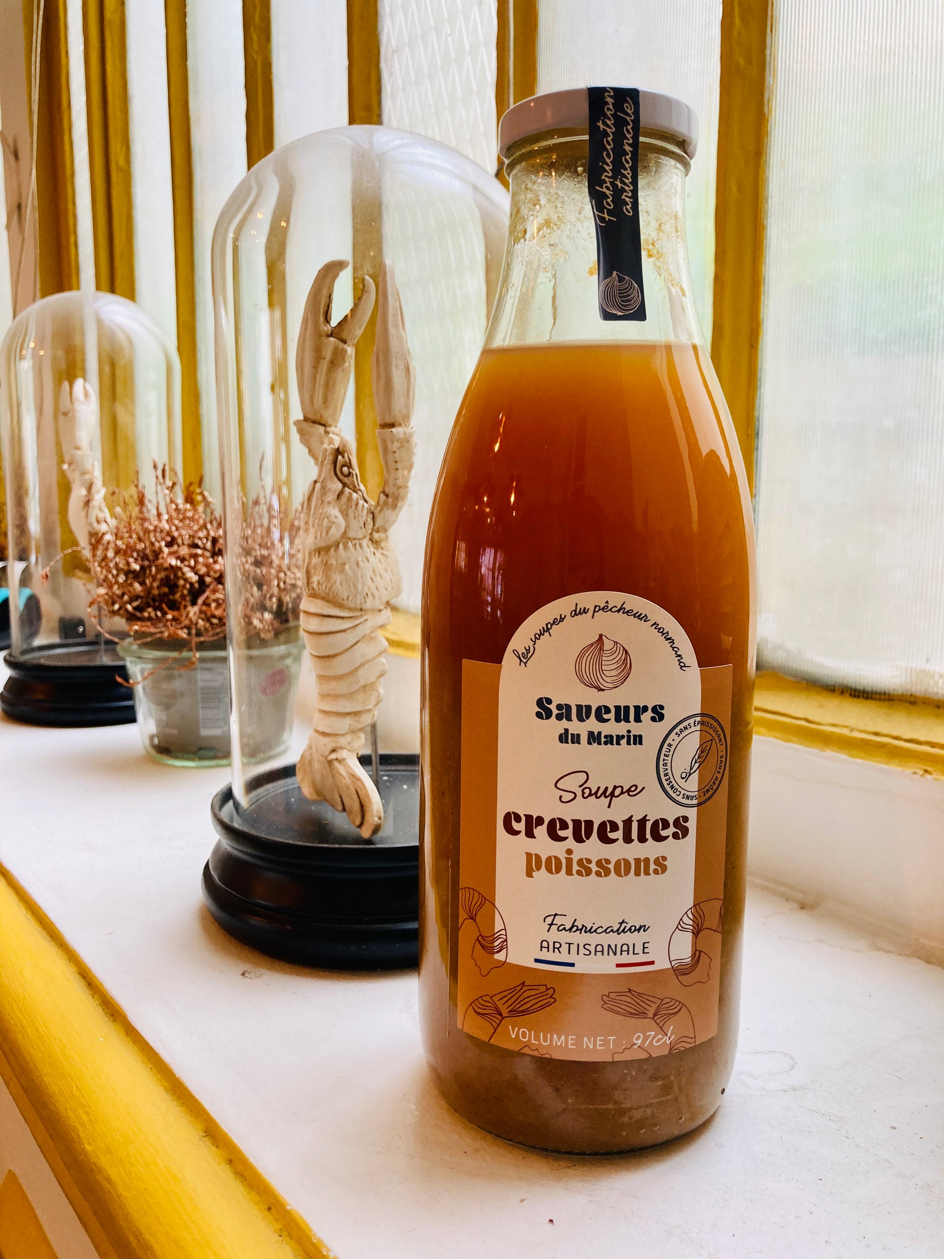 Eau, CREVETTES 14,8 %, POISSONS DE ROCHE* 7,4 %, carottes, poireaux, concentré de tomates, vin blanc, oignons frits (oignons, huile de tournesol), sel, herbes de Provence, poivre, piment.