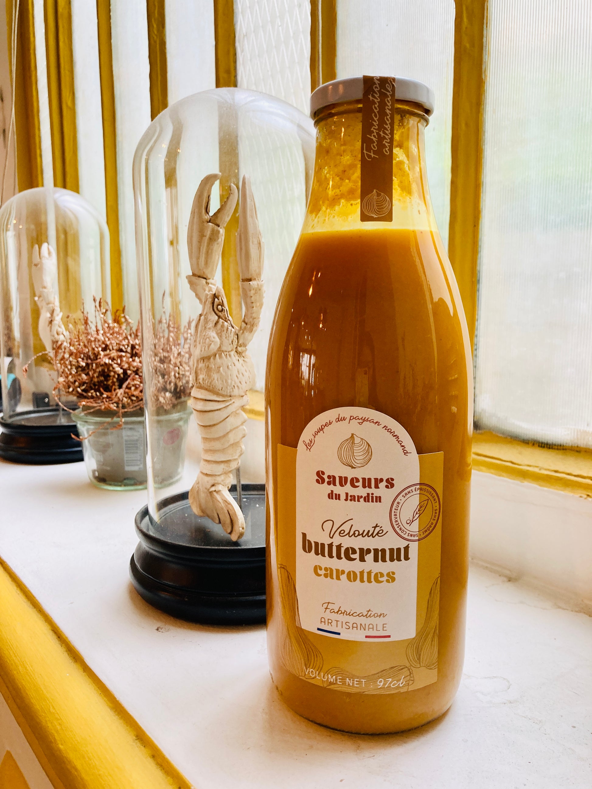 Butternut* 33,6 %, carottes* 31,6 %, eau, oignons frits (oignons, huile de tournesol), sel, cumin.